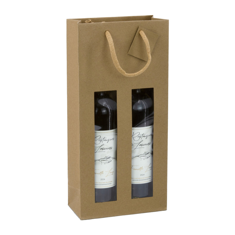 Sac 2 bouteilles fenêtre pour mettre vos produits en valeur, fabiqué à partir d'un papier en kraft brun résistant et qualitatif en 175gr d'épaisseur. Muni de poignées en papier et d'une carte message.