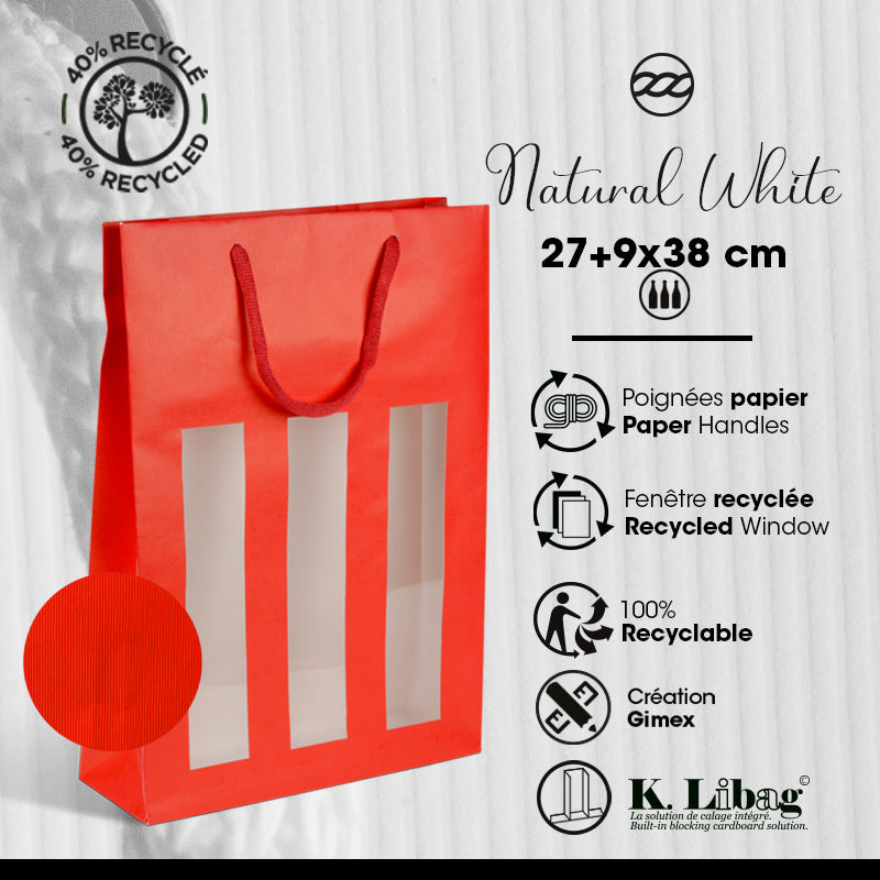 Sac 3 bouteilles à fenêtre Natural Red kraft rouge poignées papier 27+9x38cm par 100
