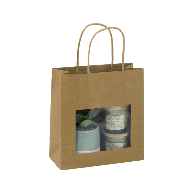 Sac boutique avec vitrine pour mettre vos produits en lumière, fabriqué à partir d'un papier kraft brun résistant et qualitatif en 180gr d'épaisseur. Muni de poignées papier torsadées et d'une vitrine en PET.